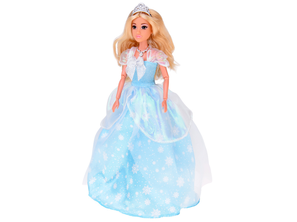 Ubrana w błękitną suknię, która mieni się jak lodowe kryształki w promieniach słońca, księżniczka wygląda jak bohaterka zimowej bajki. Materiał pod spodem ma narysowane płatki śniegu, wirujące na wietrze. Na jej głowie lśni srebrna tiara - symbol królewskiej mocy, dzięki której może zmieniać najzwyklejszy dzień w śnieżne marzenie. Dopełnieniem całej stylizacji oraz kompletem z tiarą jest jej srebrny naszyjnik.