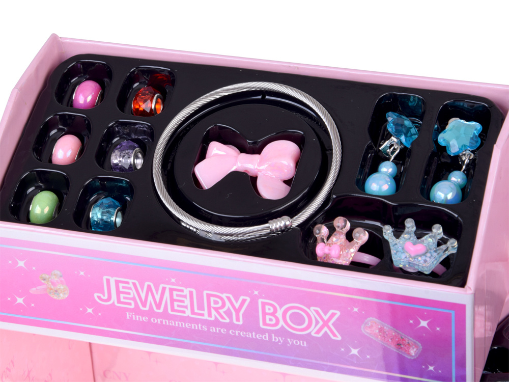 Pierwszy poziom składa się z dwóch przegródek, na których znajdziemy kolczyki, pierścionki a także akcesoria do ozdobienia metalowej bransoletki oraz łańcuszka. Gdy rozsuniemy ścianki na boki, czeka nas kolorowy zawrót głowy! Drugi poziom skrywa bowiem mnóstwo koralików o różnych rozmiarach, kolorach pozwalających na stworzenie własnoręcznie wykonanej biżuterii. Możemy korzystać z pomysłów zawartych w dołączonej do zestawu książeczce, lub też tworzyć ozdoby według własnego pomysłu. Pod kasetką z koralikami znajdziemy szpulkę z elastyczną żyłką do bransoletek oraz plastikową pęsetę ułatwiającą nawlekanie koralików. Po wysunięciu trzeciego poziomu odkryjemy przepiękne ozdoby do włosów, które świetnie uzupełnią stylizację. Oprócz 2 gumek z uroczymi detalami znajdziemy 3 eleganckie, podłużne spinki oraz fikuśne kokardki z tiulu i koronki.