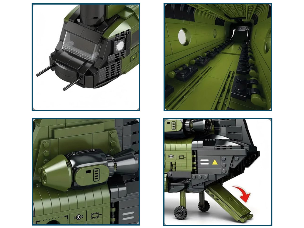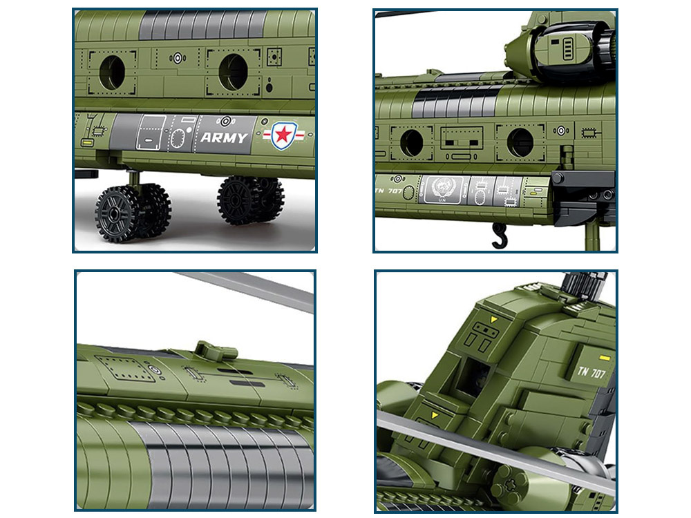 Budowa tego modelu to prawdziwa przyjemność dla pasjonatów militariów, modelarstwa i techniki. Każdy element został starannie zaprojektowany, aby stworzyć solidną i realistyczną konstrukcję wiernie oddającą wygląd legendarnego helikoptera CH-47 Chinook. To nie tylko zestaw klocków – to wyjątkowe doświadczenie budowania, które daje satysfakcję i efektowny model do kolekcji.