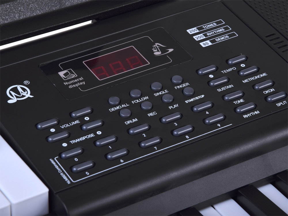- Wyświetlacz: numeryczny LED – pokazuje numery tonów, rytmów i utworów demo