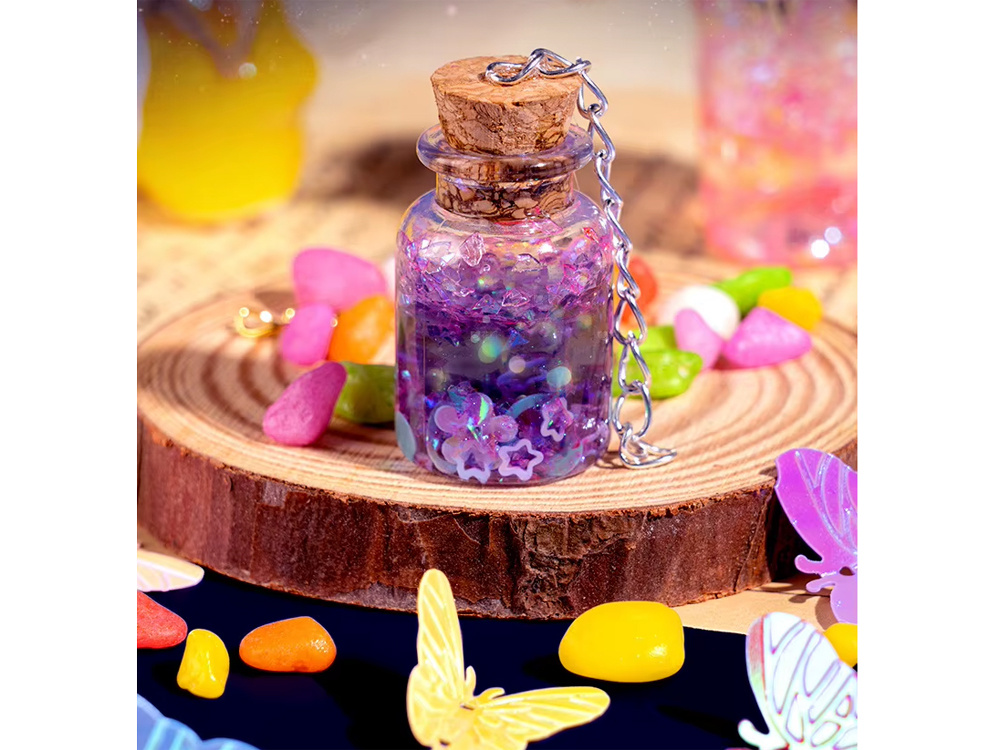 - Zatkaj butelkę korkiem i udekoruj ją dowolnie. Możesz użyć motyli, cekinów, czy kamyczków, naklejając je za pomocą kleju z zestawu.