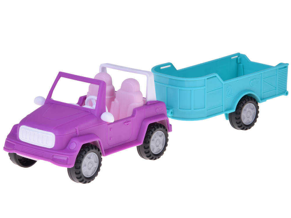 • mała lalka, laleczka, figurka dziewczynki, dziewczynka, autko, w autko, pojazd, fioletowe auto typu jeep, przyczepka, przyczepa na konia, koń. konik, kucyk z marchewką, marchewka, farma