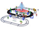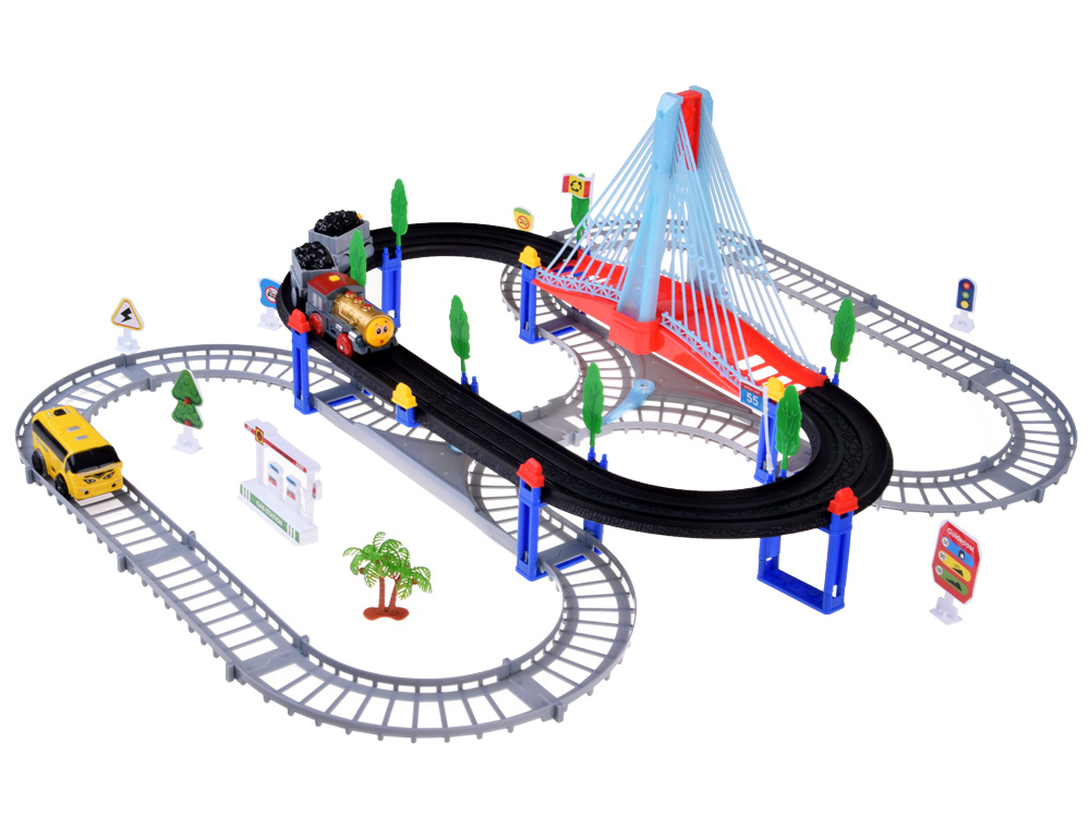 - W zestawie: lokomotywa, autobus, wagony, elementy toru, most wiszący, akcesoria (drzewka, znaki, pojazdy)