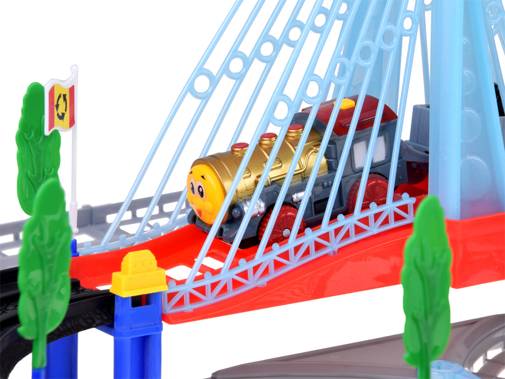 - Efekty dźwiękowe i świetlne – lokomotywa wydaje realistyczne dźwięki silnika, gra wesołe melodie, a podczas przejazdu przez most rozbłyskują kolorowe światełka.