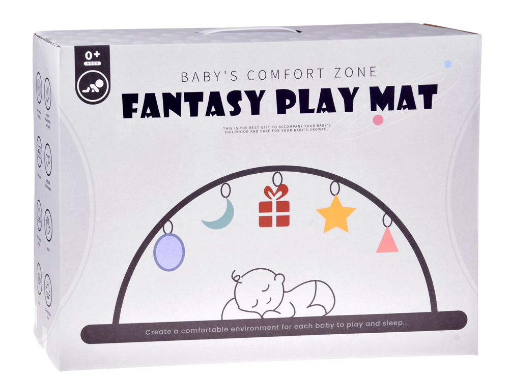 - Zestaw zawiera: mata, 2 pałąki, zestaw interaktywnych zawieszek (m.in. lusterko, karty kontrastowe, gryzaki gwiazdki, miękka kontrastowa piłka, grzechotka, szeleszczące elementy).
