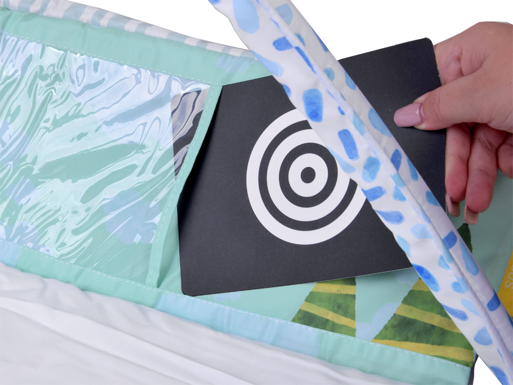 - Stymulujący design – kontrastowe wzory, materiały szeleszczące i kolory przyciągają uwagę dziecka, rozwijając percepcję wzrokową, słuchowa i dotykową.