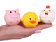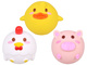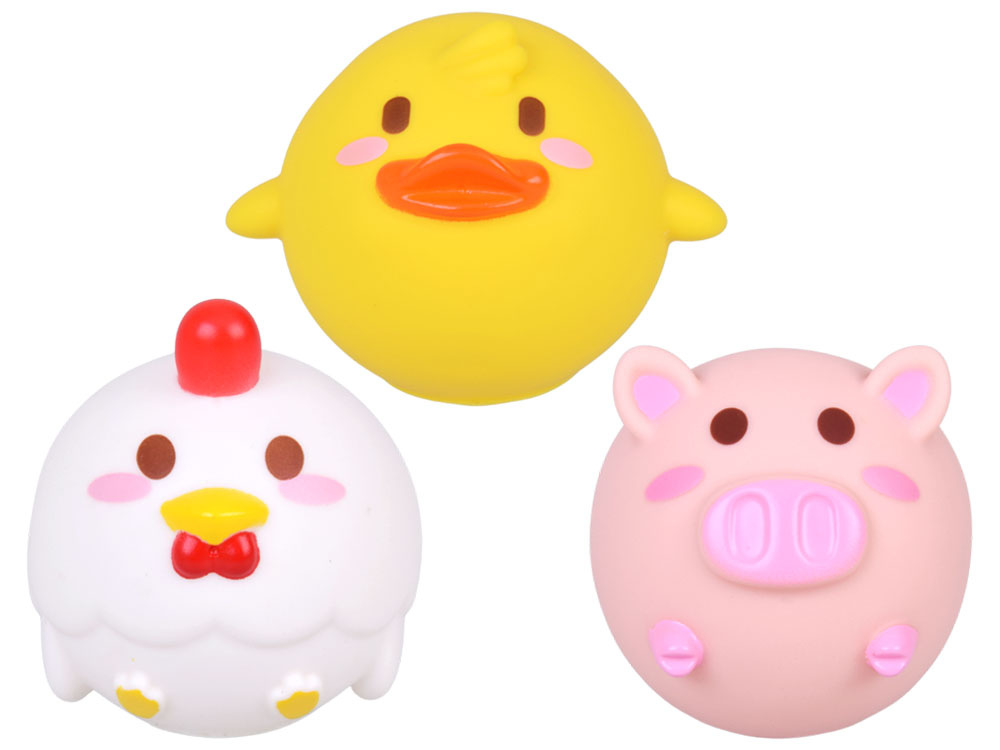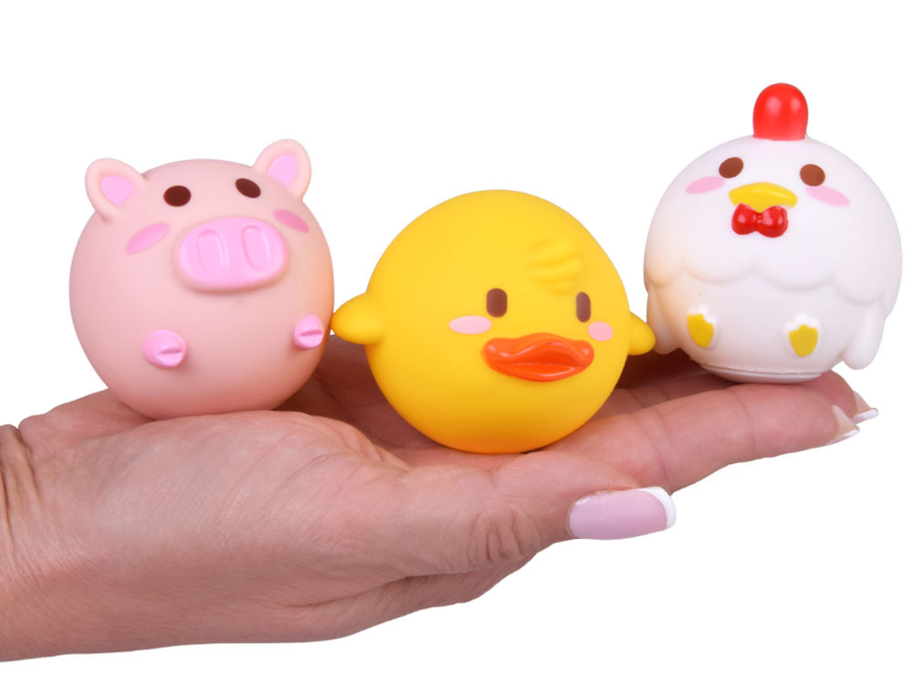 Wymiary sitka: 23 cm x 15 cm x 5 cm - 3 zwierzątka - świnka, kurka oraz kaczuszka - wszystkie są tego samego, okrągłego kształtu, jednak każde z nich posiada indywidualne cechy, przypominające dane zwierzę, a także inny kolor. Co ważne - zwierzaki są gumowe i nie mają dziurek, co ułatwia czyszczenie.