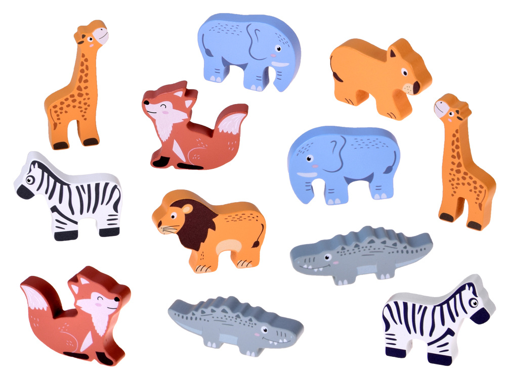 - figurki zwierząt: słonie, zebry, lwy, żyrafa, lisy, krokodyle, ptaki