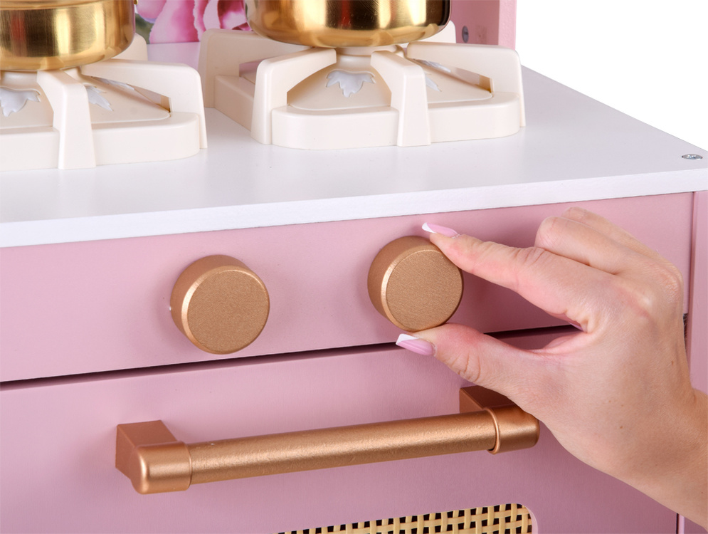 • Drewniana kuchnia dla dzieci „Różana Elegancja” – różowa kwiatowy design kuchnia retro boho dla dzieci drewniana kuchnia dla dziewczynki