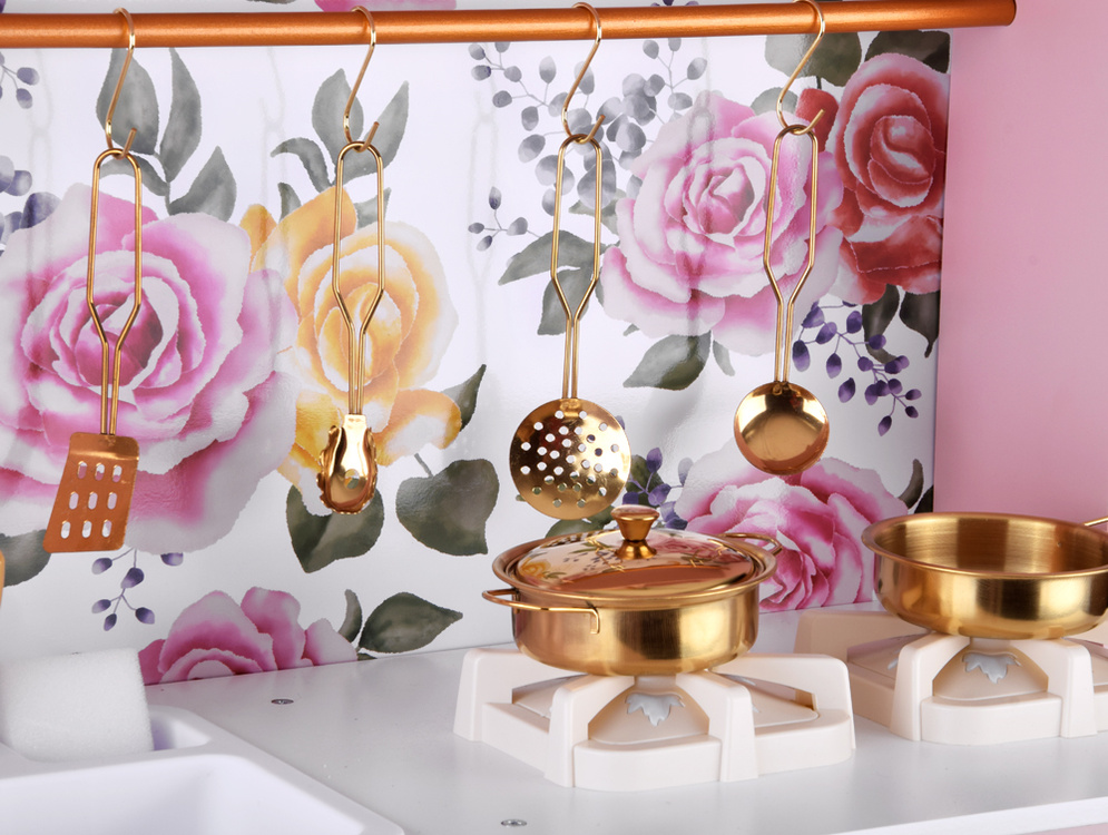 Kuchnia została wykonana w stylu retro, z dbałością o każdy detal. Subtelny róż połączony ze złotymi dodatkami oraz kwiatowy wzór na ścianie sprawiają, że całość wygląda niezwykle elegancko i będzie piękną ozdobą każdego dziecięcego pokoju.