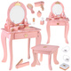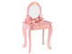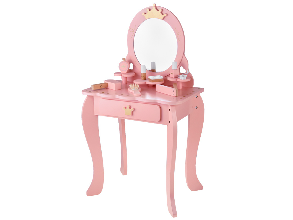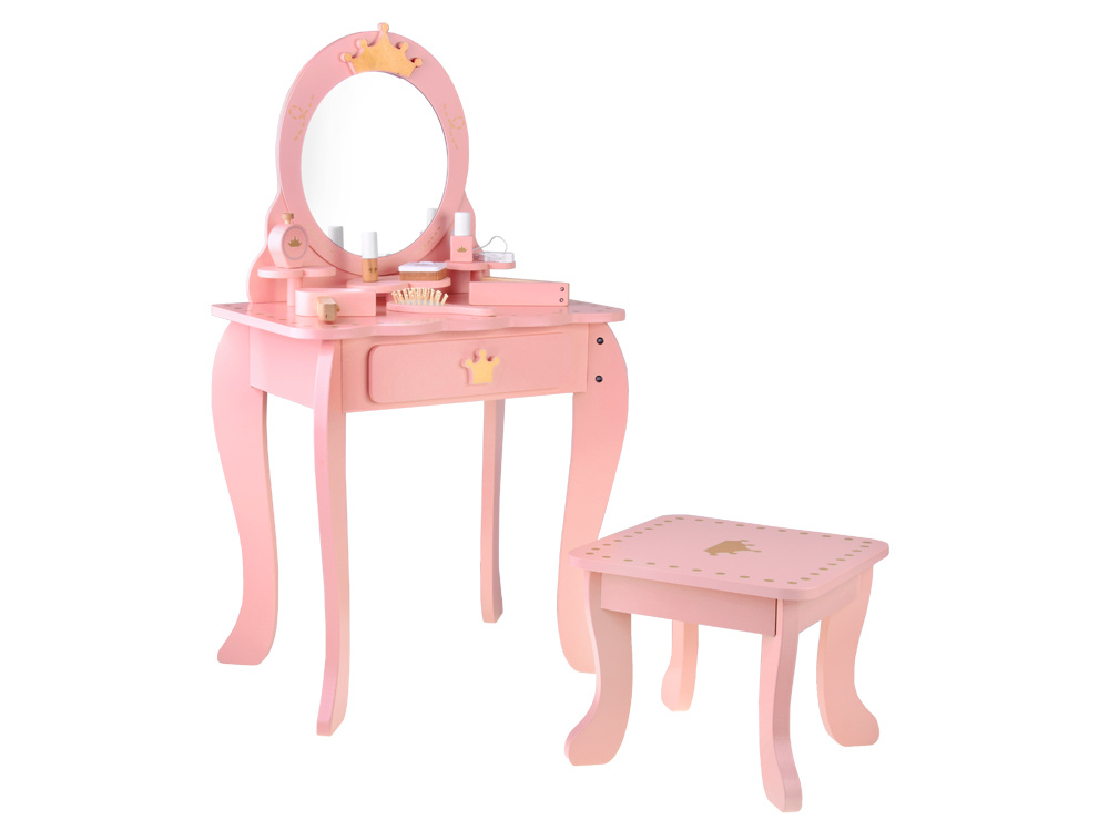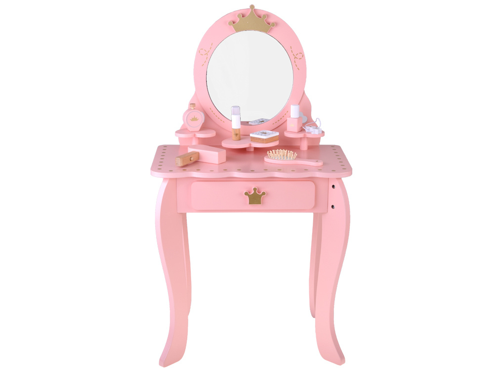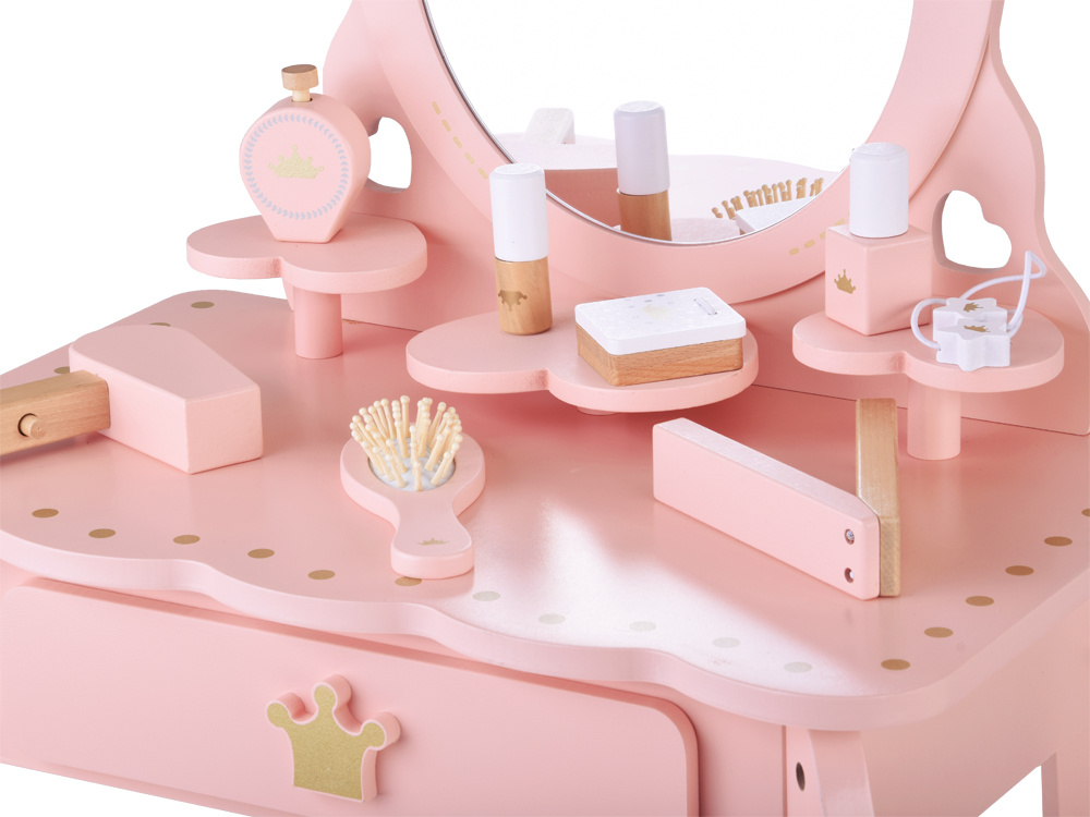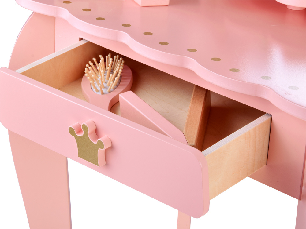Elegancka, królewska toaletka w pastelowym różowym kolorze ze złotymi ozdobami to wymarzony mebel każdej małej księżniczki. Doskonale sprawdzi się jako wyjątkowa ozdoba pokoju i praktyczny kącik do zabawy w kreowanie modowych i makijażowych stylizacji.