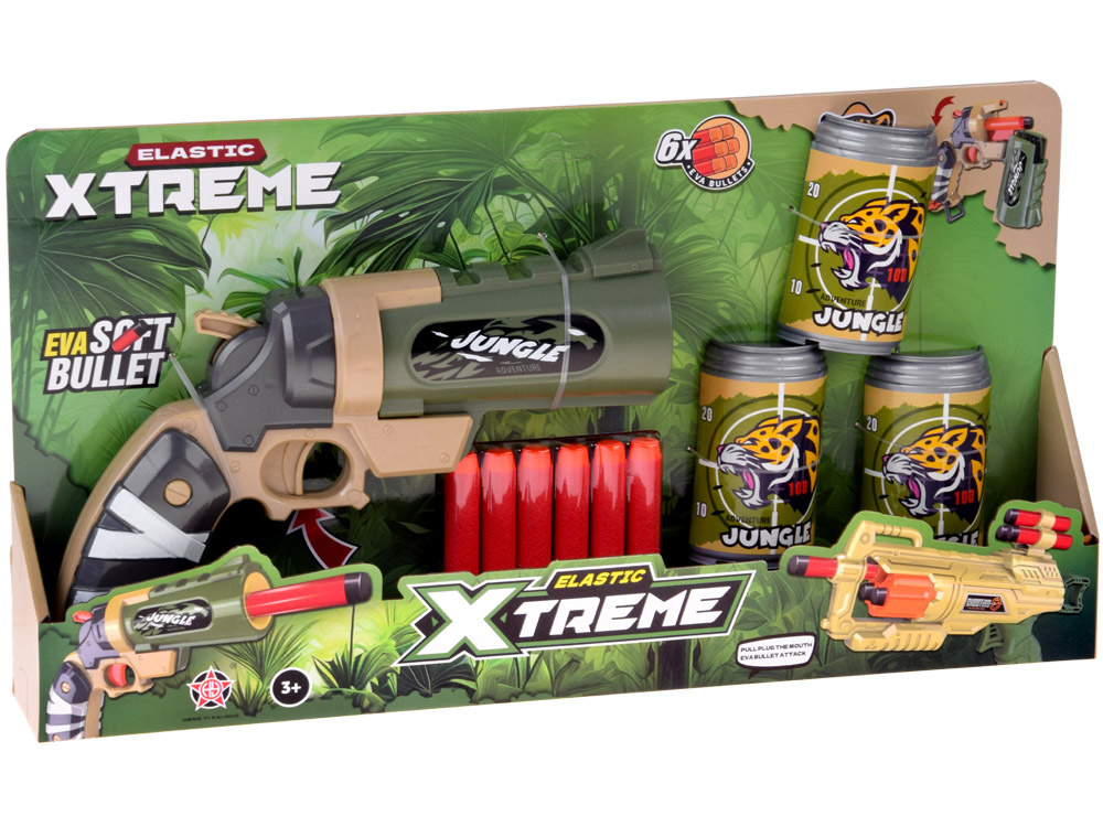 Starannie wykonany pistolet zabawkowy zapewnia wiele emocjonujących rozgrywek. Obudowa z wytrzymałego plastiku oraz miękkie, piankowe naboje z gumową końcówką gwarantują bezpieczną zabawę. Karabin wyposażono w automatyczny magazynek na 6 naboi — po załadowaniu wystarczy wycelować w plastikowe puszki i nacisnąć spust, aby oddać strzał.