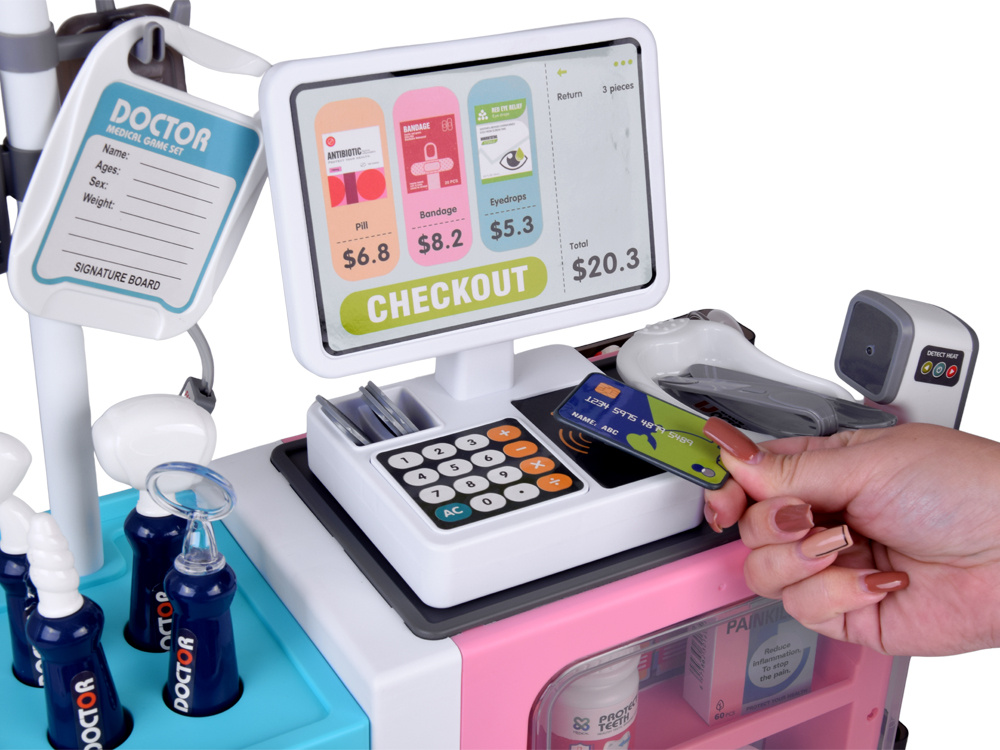 Największą atrakcją jest interaktywna kasa, która wydaje realistyczne dźwięki podczas nabijania produktów. Do zestawu dołączony jest terminal płatniczy, który pika przy zbliżeniu karty – zupełnie jak w prawdziwym sklepie!