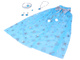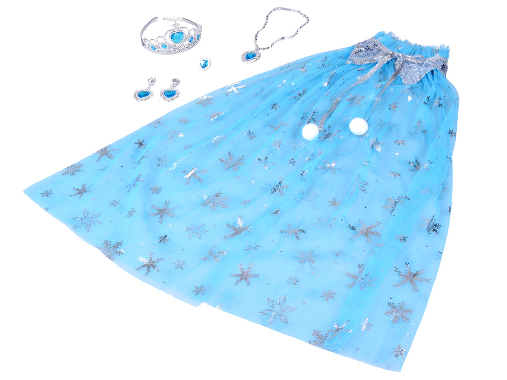 W zestawie znajduje się lekka, jasnoniebieska peleryna, ozdobiona srebrnymi cekinami oraz tego samego koloru - śnieżynkami. Elementy, którymi można ją związać na szyi/barkach to dwa puszyste, białe pomponiki.