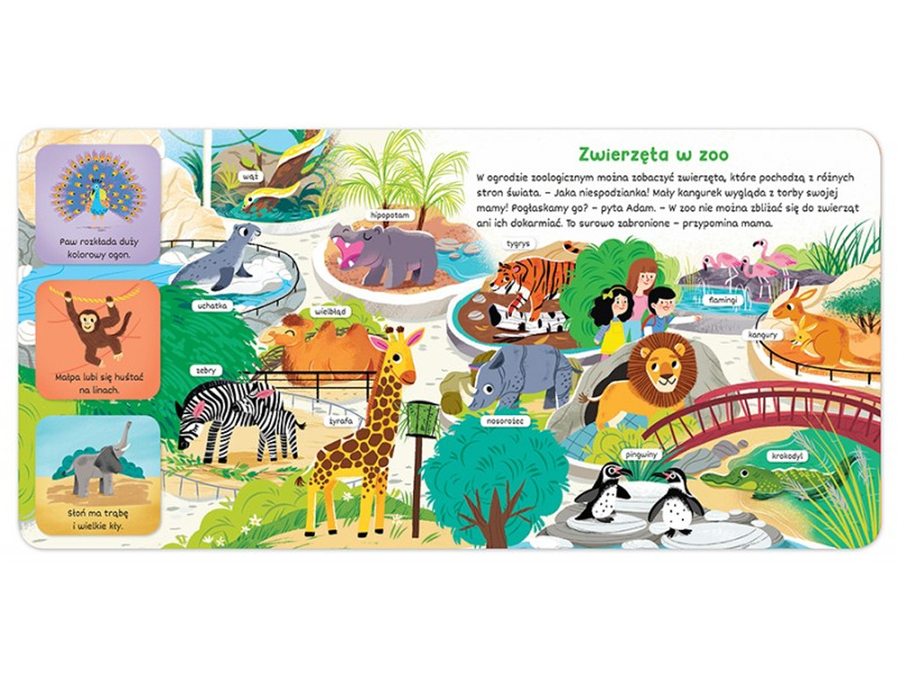 - Poznasz zwierzęta z zoo, sawanny, lasów, pól i łąk, a także zwierzęta domowe i wiejskie.