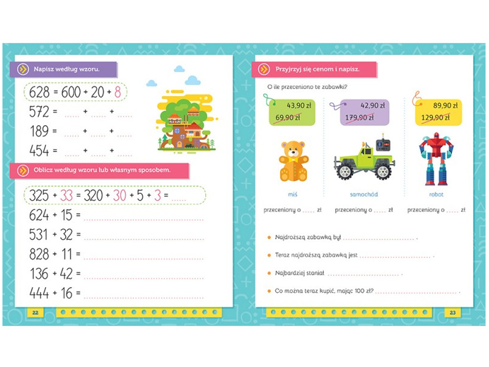 - Zawiera różnorodne ćwiczenia rachunkowe oraz ciekawe zadania tekstowe, które uczą logicznego myślenia i zastosowania matematyki w praktyce.