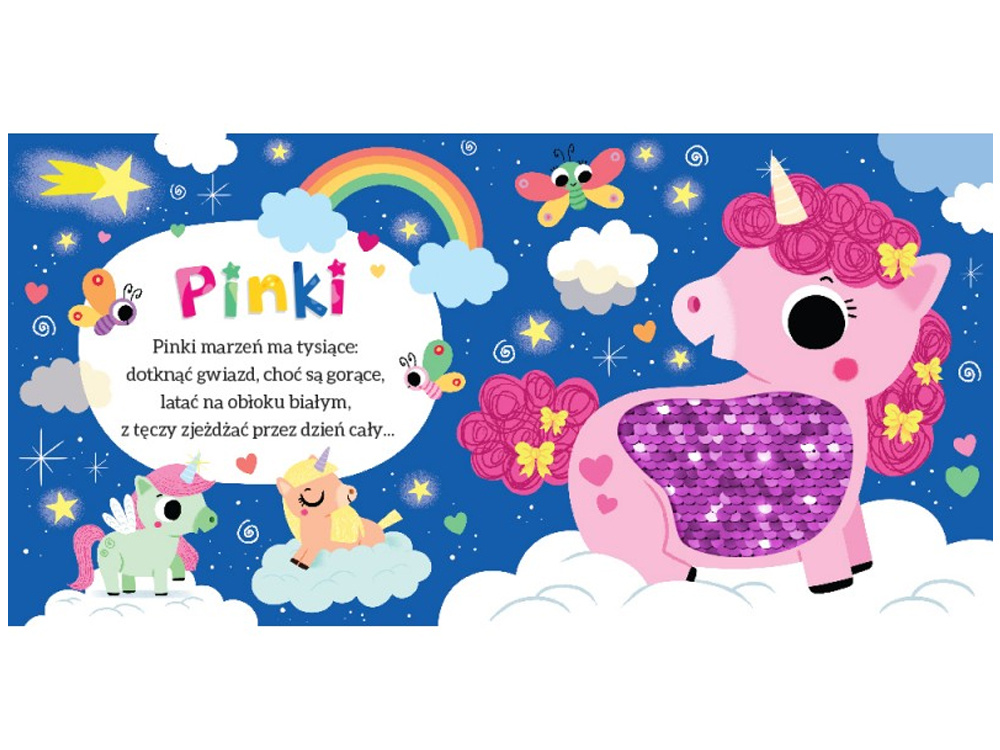 W tej wyjątkowej książeczce nie tylko oglądasz magiczne jednorożce – możesz je też dotknąć! Każda strona to nowe spotkanie z barwnym bohaterem i niezwykła przygoda sensoryczna dzięki dwustronnym, kolorowym cekinom.