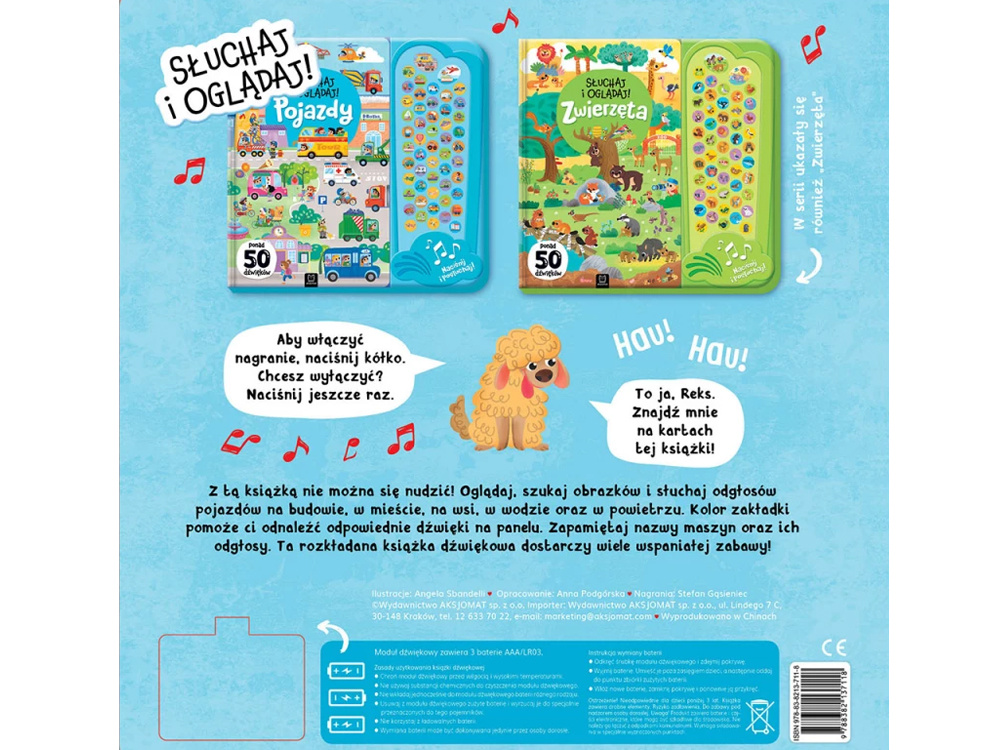 format: | 31 x 31,5 cm + rozkładane skrzydełka zwiększające format, karton, ilustracje barwne, moduł dźwiękowy z 52 odgłosami |