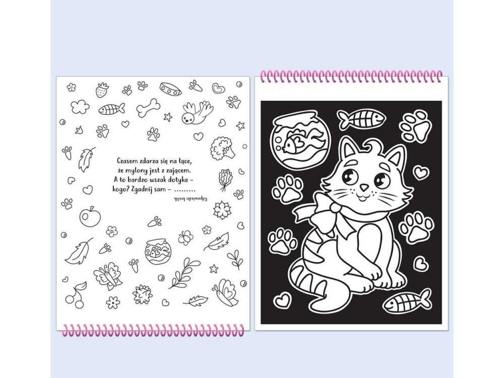 format: | 16 x 27 cm; strony pokryte przyjemnym w dotyku i ułatwiającym kolorowanie welurem, perforacja, ilustracje czarno-białe, spirala, dołączone flamastry |