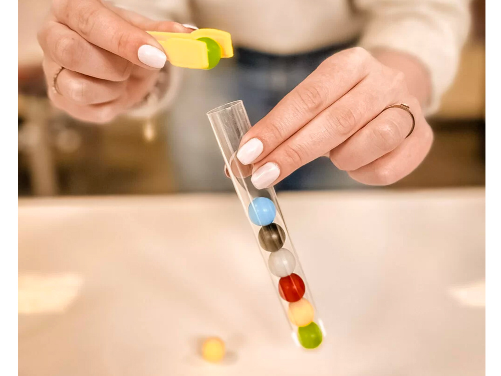 Podstawą zabawy jest chwytanie kolorowych kulek pęsetą i umieszczanie ich w probówce. Dzieci mogą to robić w dowolnej kolejności lub odwzorowując konkretne układy przedstawione na kartach wzorów. Taka aktywność pozwala ćwiczyć precyzję ruchów, cierpliwość oraz koordynację wzrokowo-ruchową.