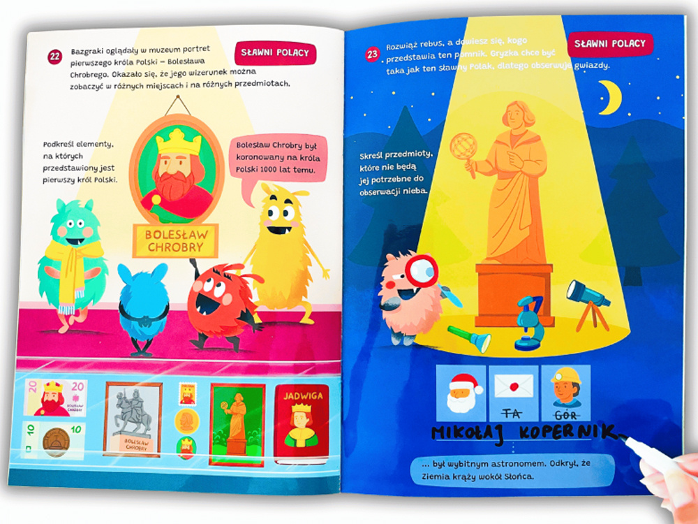 W środku znalazły się również piękne, kolorowe ilustracje, które przedstawiają charakterystyczne stroje ludowe, tradycyjne potrawy, znane zabytki oraz elementy polskiej przyrody. Dzięki temu dziecko nie tylko uczy się poprzez działanie, ale też poznaje estetykę i bogactwo polskiej kultury.