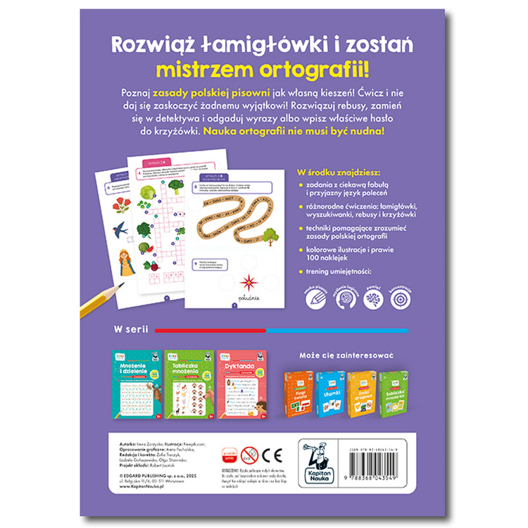 Kapitan Nauka EDUseria. Ortografia. Ćwiczenia to praktyczna i atrakcyjna książeczka edukacyjna, która pomaga dzieciom opanować zasady polskiej ortografii w jasny, uporządkowany i przystępny sposób. Dzięki różnorodnym zadaniom nauka poprawnego pisania staje się ciekawa, angażująca i pełna satysfakcji.