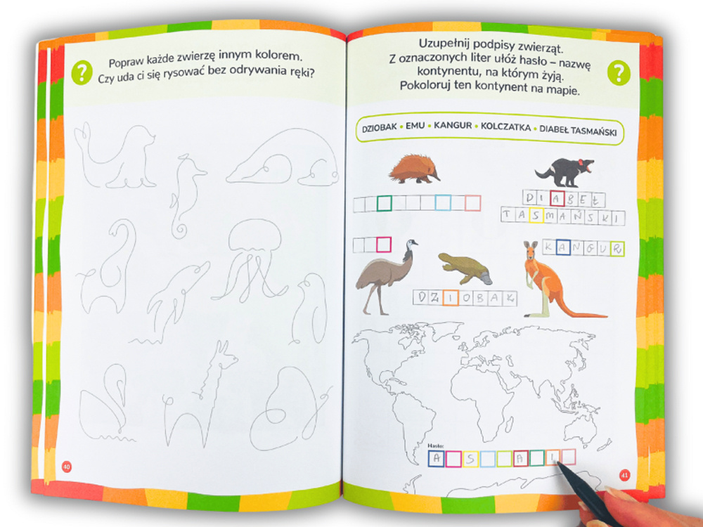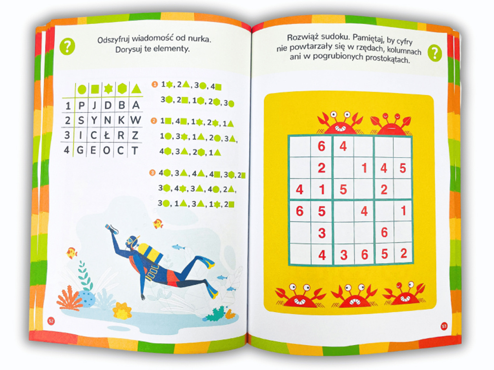 - książeczka z kolorowymi łamigłówkami i zagadkami,