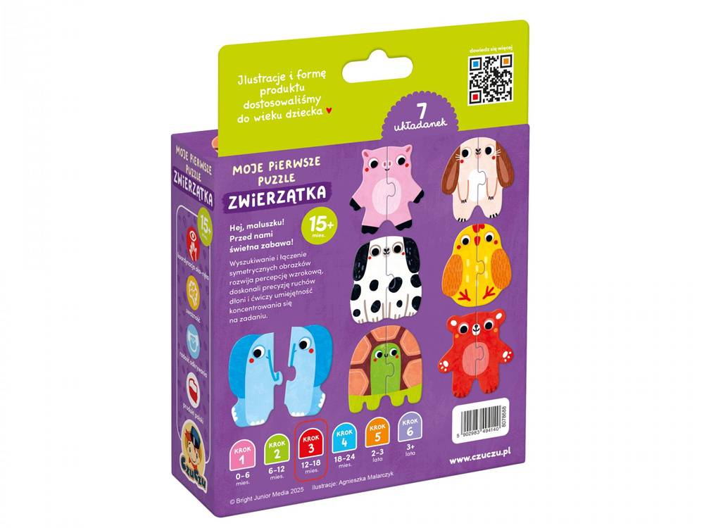 My First Puzzles – Animals to uroczy zestaw dwuelementowych układanek, który wprowadza najmłodszych w świat zabawy i nauki. Łączenie symetrycznych połówek puzzli pomaga rozwijać spostrzegawczość i sprawność dłoni. Nazywanie zwierzątek wspiera budowanie słownictwa i wiedzy o świecie, a wymyślanie historii czy naśladowanie dźwięków i ruchów zwierząt rozwija kreatywność i wyobraźnię.