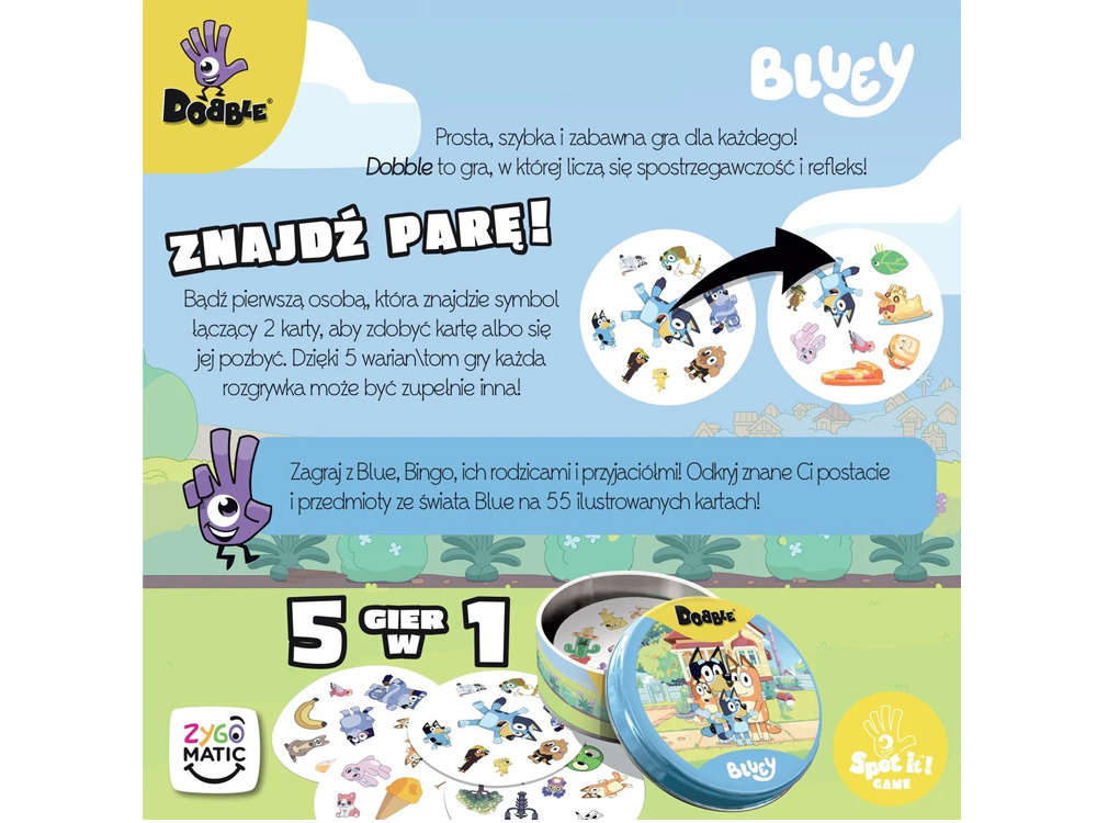 Blue, Bingo i ich rodzice zapraszają do wspólnej zabawy pełnej śmiechu, refleksu i spostrzegawczości. Wersja kultowej gry Dobble inspirowana światem uroczej rodziny Heelerów z animacji Bluey to idealna propozycja dla najmłodszych graczy i ich rodziców.