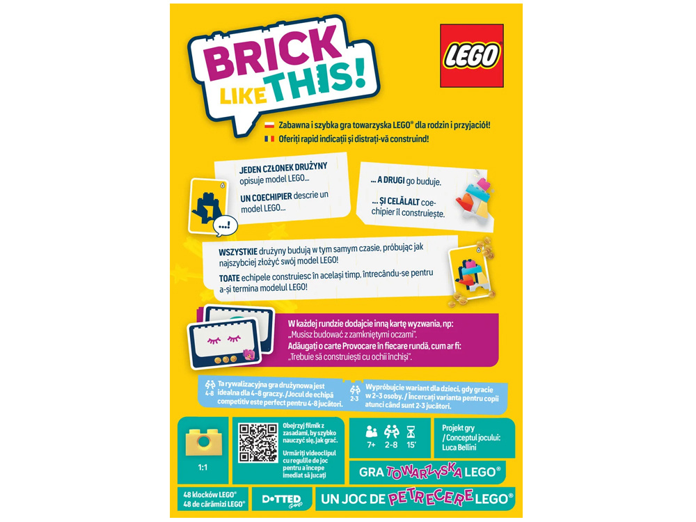 LEGO Brick Like This to dynamiczna gra towarzyska, w której liczy się współpraca, komunikacja i szybkie myślenie. To doskonała propozycja zarówno dla rodzin, jak i grup przyjaciół. Zadaniem graczy jest zbudowanie z klocków LEGO modelu przedstawionego na karcie – ale z pewnym utrudnieniem. Jedna osoba z drużyny widzi kartę i opisuje kształt, a druga – na podstawie wskazówek – próbuje zbudować model.