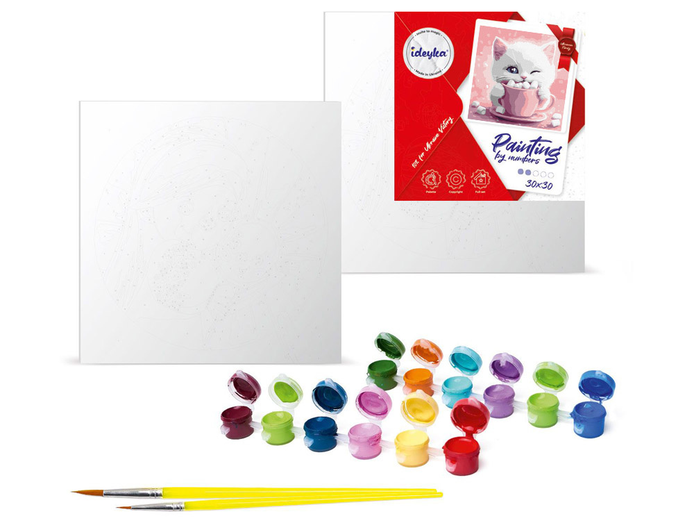 - Gotowe do malowania płótno płótno z motywem uroczego kotka podzielone na pola oznaczone numerami