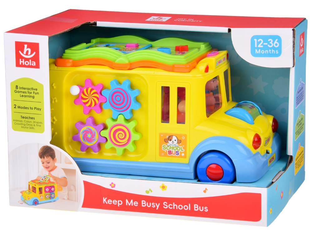 Autobus szkolny interaktywny potrafi samodzielnie jeździć, zmieniając za każdym razem kierunek, kiedy napotka przeszkodę, ale może też być sterowane samodzielnie przez dziecko. W trakcie jazdy gra wesoła muzyczka i migają przednie światła. Z przodu autobusu znajduje się kolorowy obrotowy wałek ze zwierzątkami, który po przekręceniu powoduję uruchomienie odgłosy śmiejącego się dziecka i melodyjki.